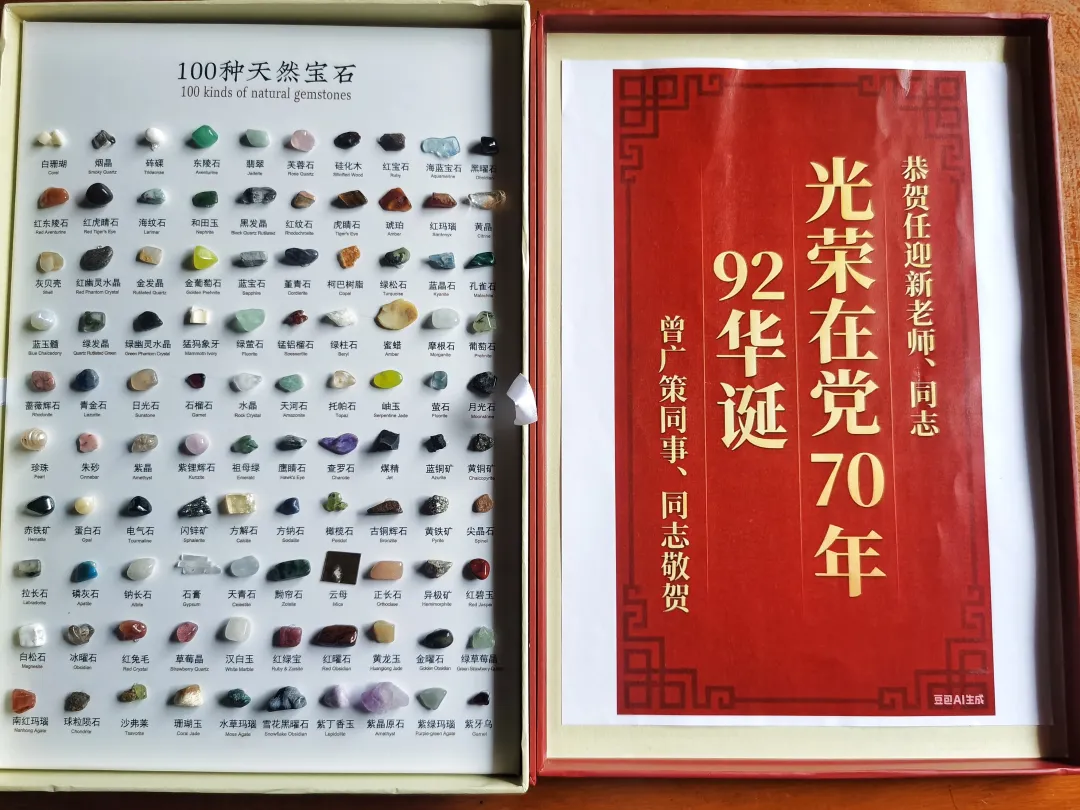 此次慰问情深意切,支部不仅准备了鲜花,更融入了浓厚的文化敬意。赵俊明、侯光久两位老师挥毫泼墨,书写遒劲有力的“寿”字;曾佐勋老师精心创作祝寿诗,并由赵俊明老师誊写成精美的书法作品,一笔一划皆是对老党员奉献岁月的崇高礼赞。曾广策老师则精心准备了百种天然宝石标本,以此寓意老党员历经岁月磨砺而愈发珍贵的宝石般品质。慰问组还转达了未能到场的秦松贤、葛梦春、边秋娟、涂丽娟、朱彩霞、张丽春、贾先巧等其他老同志对两位老师的深切问候和美好祝福。
