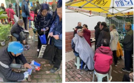 聚焦老同志日常生活需求,离退休工作处联合社区与志愿者团队,开展“家门口”的便民服务。磨刀、理发、洗鞋、健康咨询等摊位前,志愿者们以专业与热情为老同志解决生活小难题。